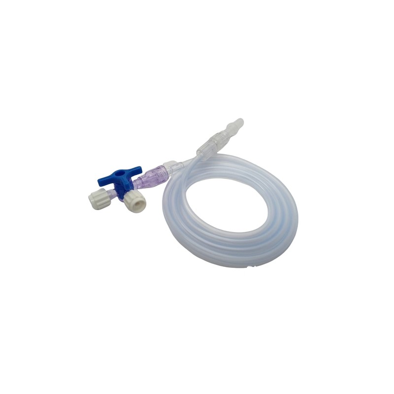 Llaves de 4 vías con marcas indicadoras del sentido en el que fluyen las soluciones y posición de cerrado aditamento de cierre luer lock (móvil) en el ramal de la llave que se conecta al tubo de la extensión. Tubo de extensión removible de plástico grado médico longitud 80 cm y diámetro interno 2.7 mm mínimo conector luer lock hembra en el extremo del tubo que se conecta con la llave y conector luer macho en el extremo proximal con aditamento de cierre luer lock (móvil). Pieza.